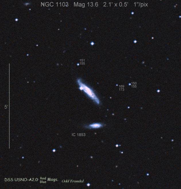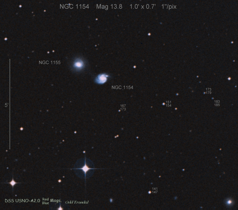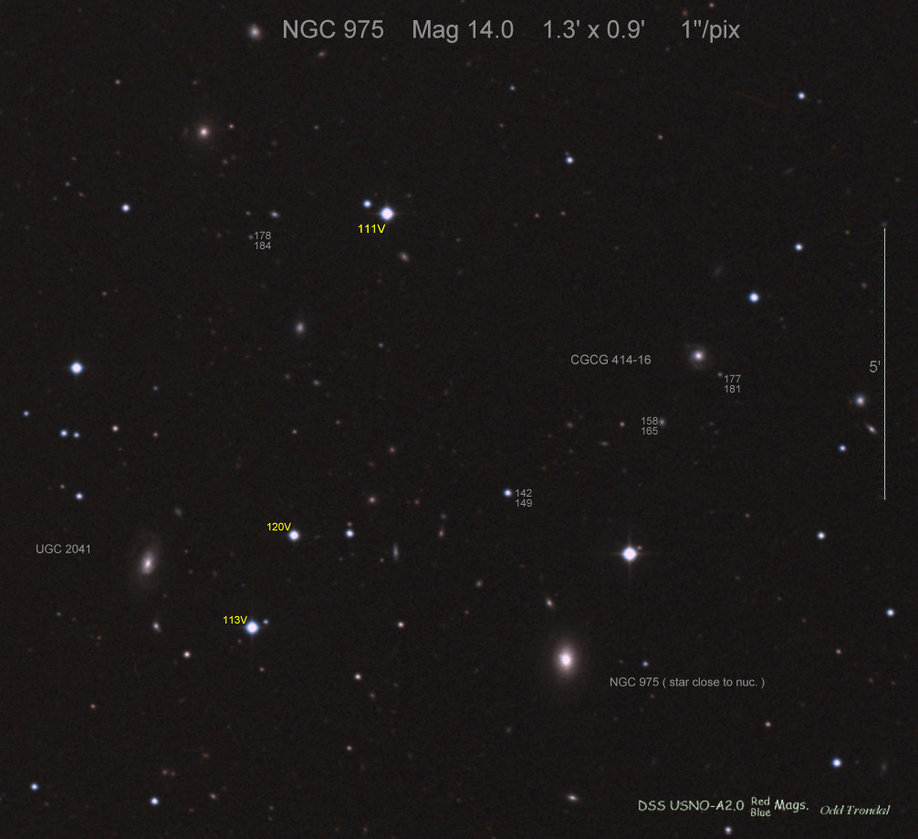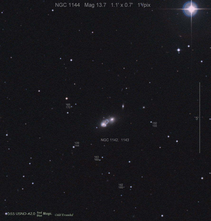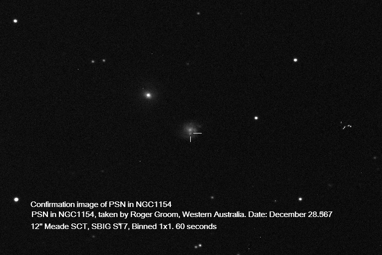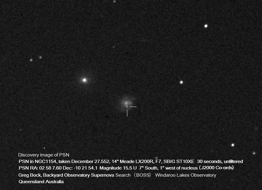 Found in NGC 1144 at R.A. = 02h55m11s.98, Decl. = -00°11'01".6 Located 3".3 west and 0".6 north of the center of NGC 1144 (Joseph Brimacombe image) Mag 17.0:8/16, Type Ia  |