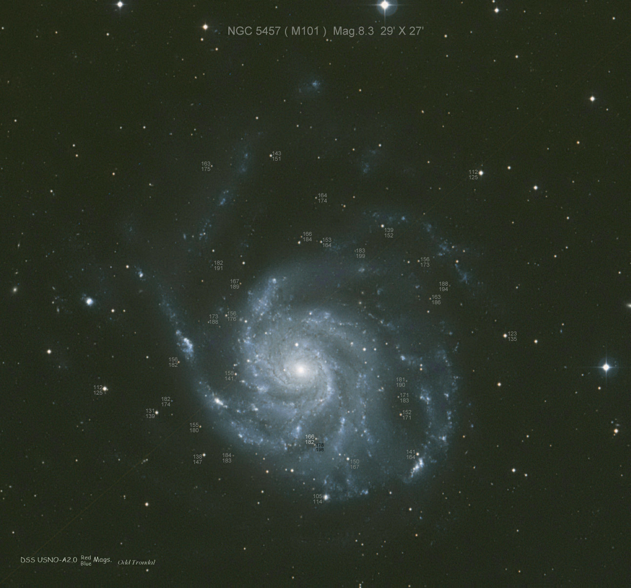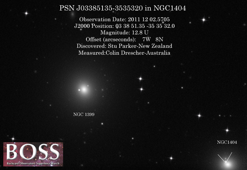 Found in M101 at R.A. = 14h03m05s.80, Decl. = +54°16'25".3 Located 58".6 west and 270".7 south of the center of M101 (Discovery image) Mag 14.6:1/28 (9.9:9/10), Type Ia (References: CBET 2792, 2804, 2863, TOCP page, AAVSO special notice 250, ATEL 3582, 3583, 3584, 3585, 3587, 3588, 3589, 3590, 3592, 3593, 3594, 3597, 3598, 3599, 3602, 3605, 3607, 3612, 3615, 3620, 3623, 3642, 3658, 3696, 3822, SN 1970G, 1951H, 1909A) 2011fe images sub-page  |