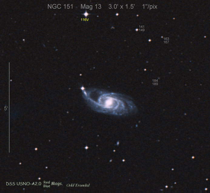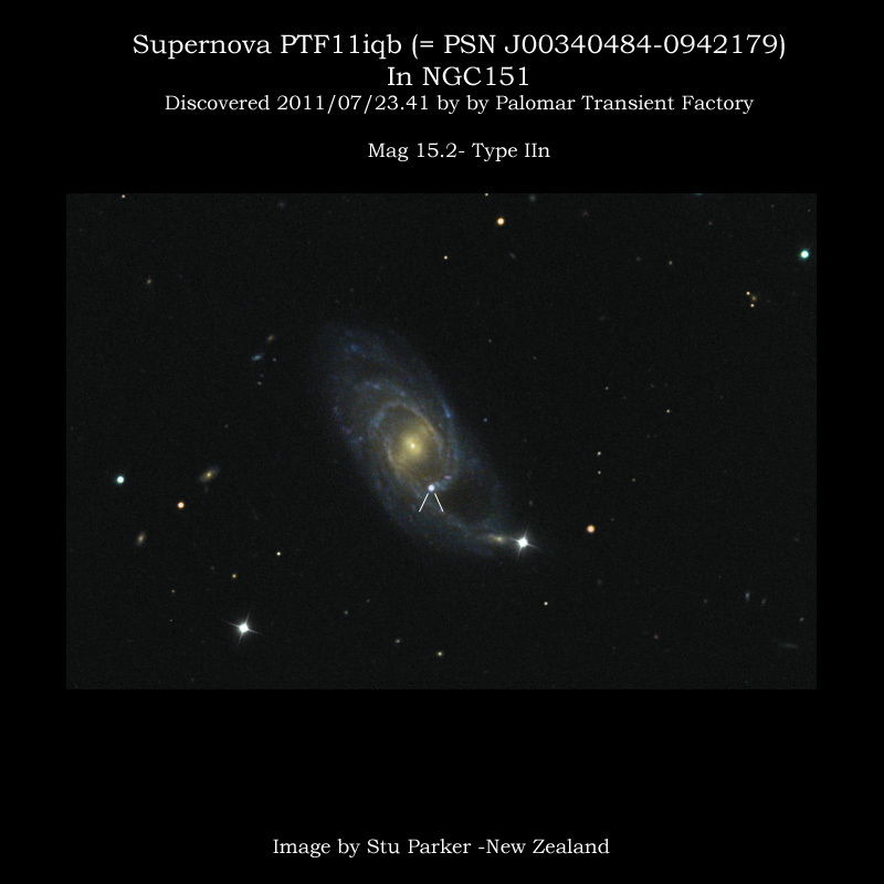 Found in NGC 151 at R.A. = 00h34m04s.84, Decl. = -09°42'17".9 Located 30".3 east and 1".1 south of the center of NGC 151 (Joseph Brimacombe image) (Joseph Brimacombe image) (JM Llapasset image) (William Wiethoff image) (Rodrigo Losada image) (Joseph Brimacombe image) (Rodrigo Losada image) (Stu Parker image color) (Stan Howerton image) (Joseph Brimacombe image) (JM Llapasset image) (Joel Nicolas image) (JM Llapasset image) Mag 17.1:11/30 (15.2), Type IIn (References: ATEL 3511, ATEL 3512, TOCP page)  |