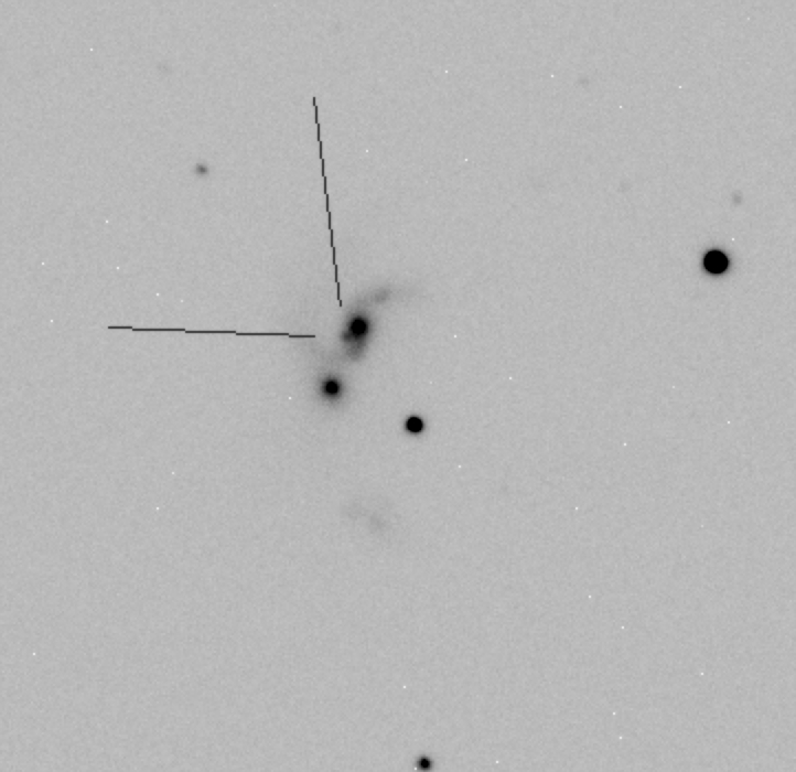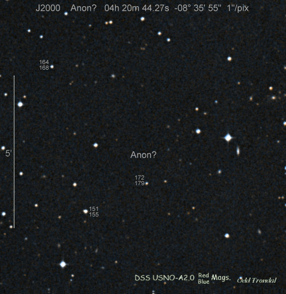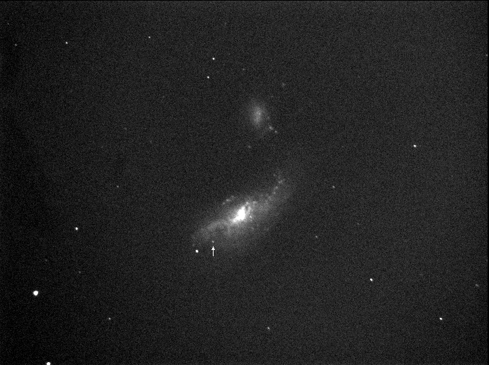 Found in an anonymous galaxy at R.A. = 04h50m27s.83, Decl. = -03°29'24".5 (near MCG -1-13-16) Located 1" west and 0" north of the center of the host galaxy (Discovery image) (Confirmation image) (Joseph Brimacombe image) Mag 18.5:1/30 (18.2:1/26), Type unknown  |