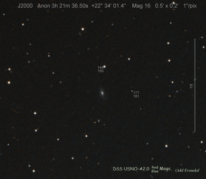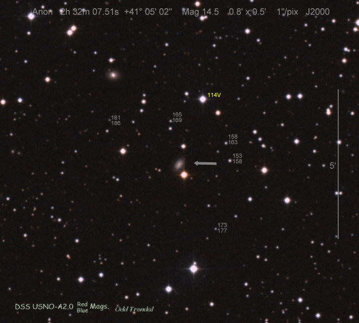 Found in an anonymous galaxy at R.A. = 03h51m35s.98, Decl. = +16°26'06".2 Located 0" east and 1" north of the center of the host galaxy (Discovery image) (Joseph Brimacombe image) Mag > 20.0 (18.1:1/19), Type unknown  |