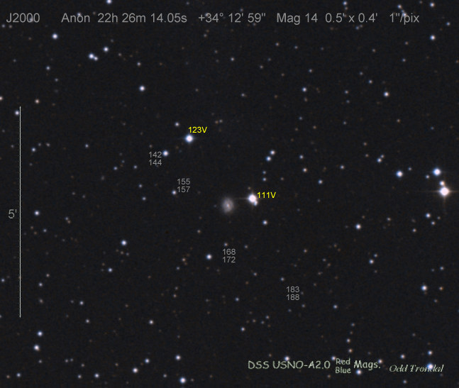 Found in an anonymous galaxy at R.A. = 01h49m47s.70, Decl. = +31°44'49".6 Located 5".3 west and 12".7 north of the center of the host galaxy (Discovery image) (Paolo Corelli image) (Joseph Brimacombe image) Mag 17.2:1/26, Type IIP (References: CBAT TOCP)  |