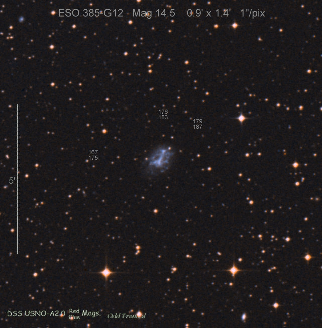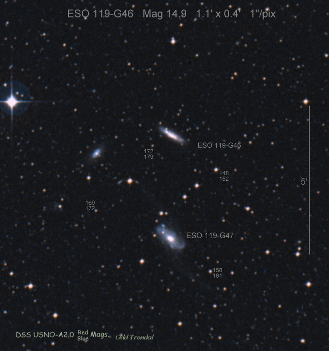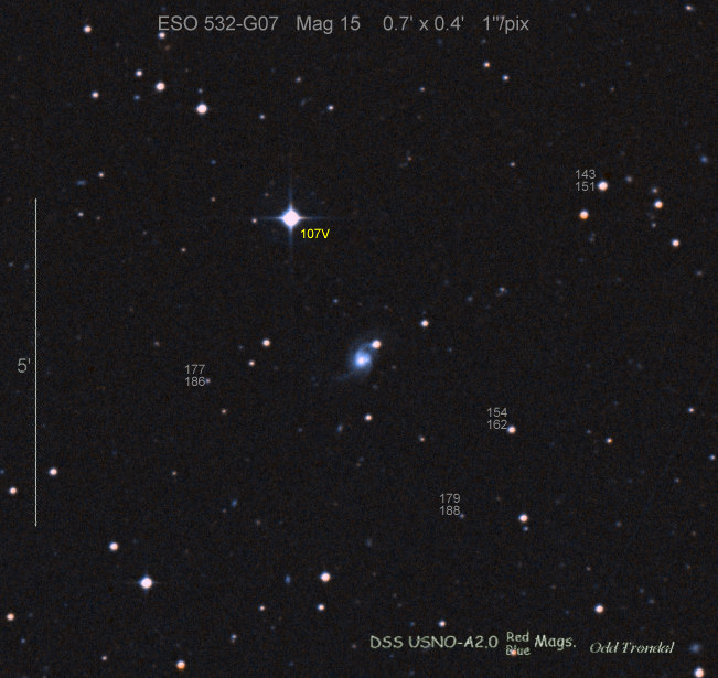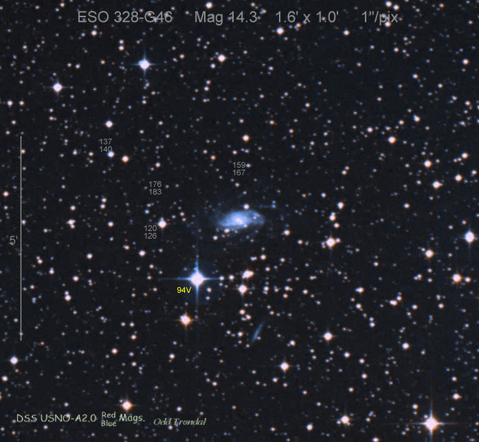 Found in ESO 328-46 at R.A. = 15h22m25s.12, Decl. = -38°12'04".2 Located 7" east and 6" south of the center of ESO 328-46 Mag 16.6:1/21, Type unknown  |