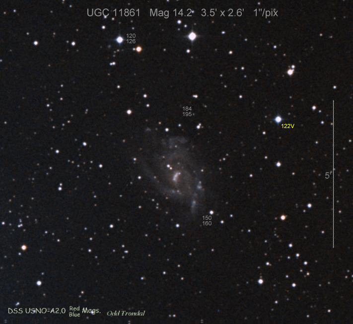 Found in UGC 11861 at R.A. = 21h56m41s.59, Decl. = +73°17'48".9 Located 73" east and 131" north of the center of UGC 11861 Mag 21.7:12/18 (14.7:6/25), Type Ia (References: CBAT TOCP) 2011dm images sub-page  |