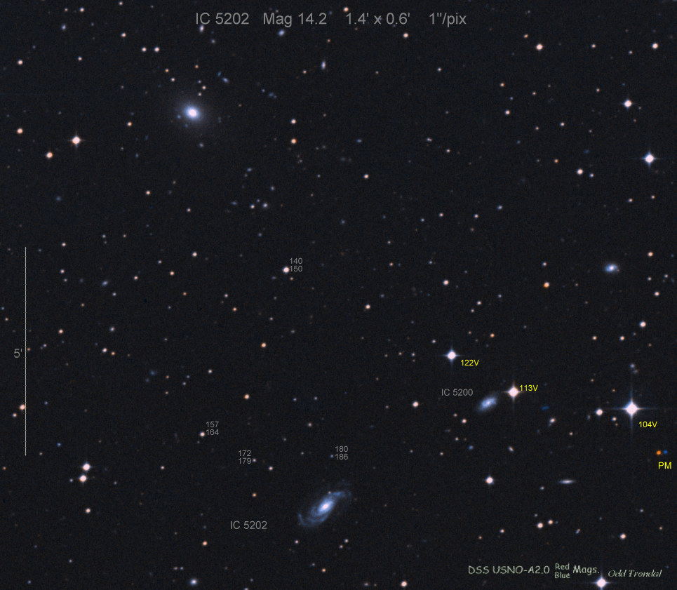 Found in IC 5202 at R.A. = 22h22m58s.48, Decl. = -65°48'43".1 Located 17" east and 33" south of the center of IC 5202 (Discovery image) (Confirmation image) Mag 17.8:1/28, Type unknown  |