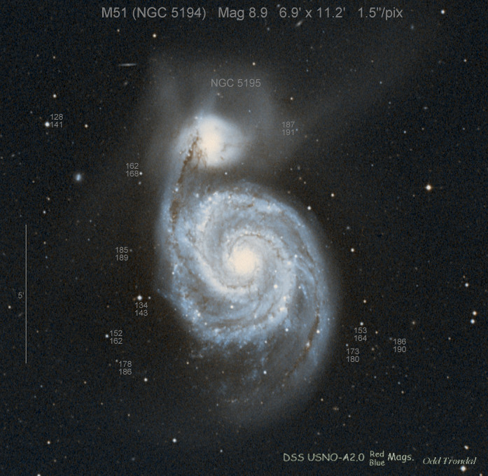 Found in M51 at R.A. = 13h30m05s.124, Decl. = +47°10'11".301 Located 138" east and 92" north of the center of M51 (Bailey discovery image) (Dupouy discovery image) (Griga discovery image) Mag 17.6:1/28 (12.1:6/19), Type IIb (References: ATEL 3398, 3399, 3400, 3401, 3402, 3405, 3406, 3411, 3413, 3414, 3428, 3431, 3432, 3433, 3435, 3456, 3641, CBAT TOCP, SN 2005cs, 1994I) 2011dh images sub-page  |