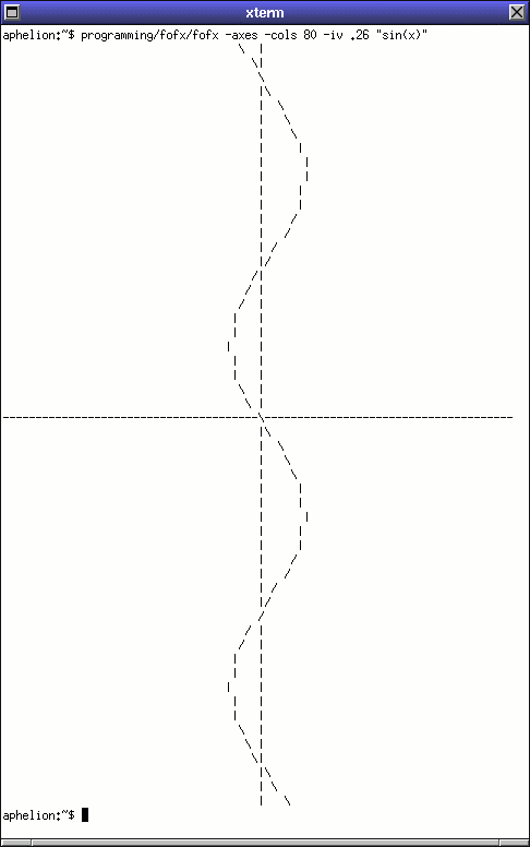 fofx is a function grapher for character-cell terminals. fofx takes a whitebread mathematical function, such as "sin(x)", and turns it into a 'graph' made up of text characters.