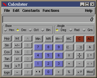 The Xforms Calculator is a programmable scientific GUI calculator for X-based systems that have the Xforms GUI library. It has most things that one would expect from such a calculator, including the ability to handle hexadecimal, decimal, octal and binary numerical representation, degree, gradient and radian angle representation, a full suite of logarithmic and triganometrical functions (including hyperbolic functions), a full suite of bit-manipulation operations, and, of course standard arithmetic operations and functions. All standard operations and functions have keyboard shortcuts associated with them, and the current display value is Copy/Paste-able. Two special features of the calculator are: