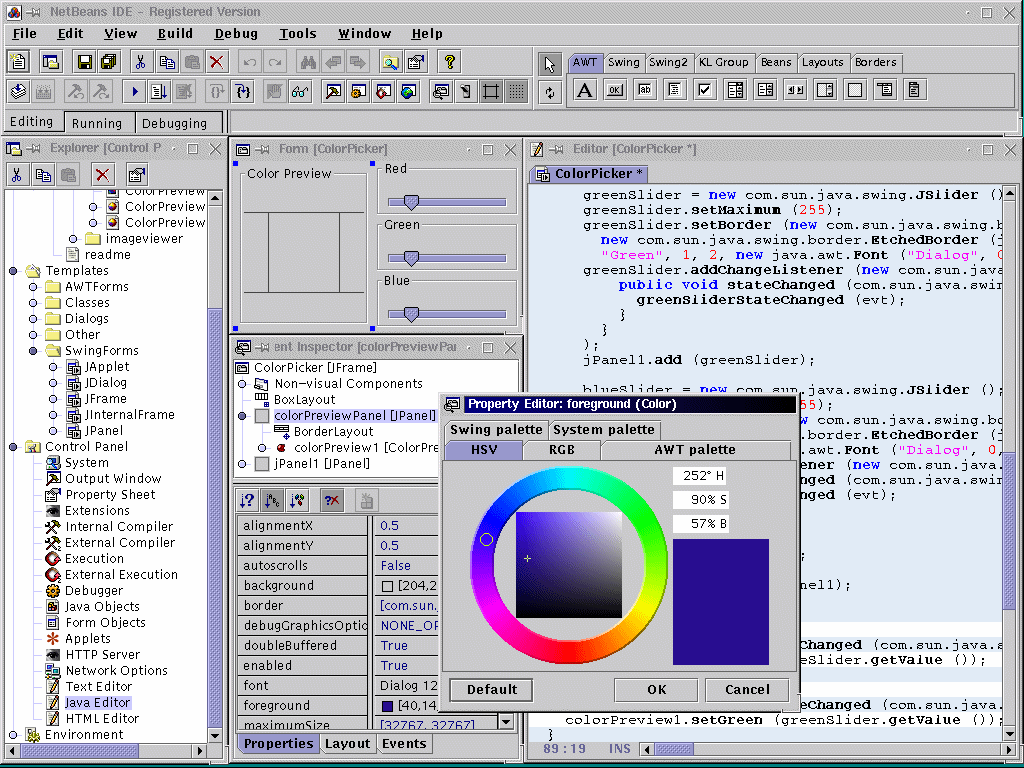 NetBeans Developers NetBeans Developer 2.0 is a programming tool for software developers who want to design and build powerful, cross-platform applications - on any platform. It is an industrial-strength development tool that is easy to learn and intuitive to operate. NetBeans Developer 2.0 is a full-featured, cross-platform Java IDE that is both written in Java and generates Java code. It combines support for all stages of application development including visual design, coding, compiling, and debugging in a comprehensive visual programming package. It runs on all platforms that support JDK(TM) 1.1.x, including Windows 95/98/NT, Linux, Solaris(TM), HP-UX, OS/2, AIX, SGI Irix, Mac and others. The IDE is based on JFC and JavaBeans Components, and all parts of the IDE are actually themselves JavaBeans. The result is an IDE where the user can fully customize the interface, modify component behavior and easily add new components. NetBeans is built to be extended and will offer APIs for users to create their own modules. The IDE features a JFC-based form editor, full Java Bean support, an integrated Java debugger, a text editor with syntax coloring, a pluggable look and feel, full support for layout managers, applet generation support, and multiple virtual desktops.