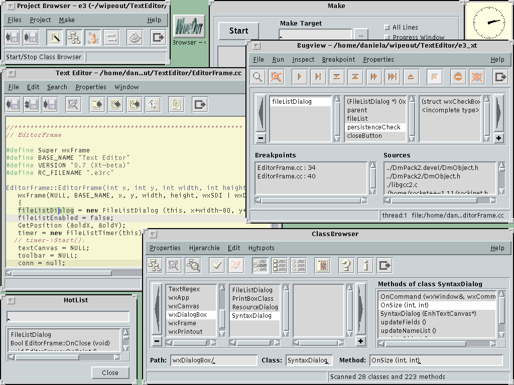 C++, Java, Eiffel, and Fortran running on Linux and other Unix systems. It consist of several components, which partly provide interfaces for existing tools such as CVS, GDB or MAKE. WipeOut supports all source code engineering tasks like generating, parsing, testing, managing, and analysing in a uniform programming environment with a highly customizable and easy to use user interface.