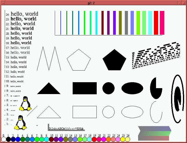 g2 is an easy to use, portable and powerful 2D graphics library. It provides a comprehensive set of functions for simultaneous generation of graphical output on different types of devices. Following devices are currently supported: PostScript, X11, GIF (using gd) and Win32 (xfig is in development). g2 is written in C (ANSI) and additionally has a Fortran and perl interface. A simple example: