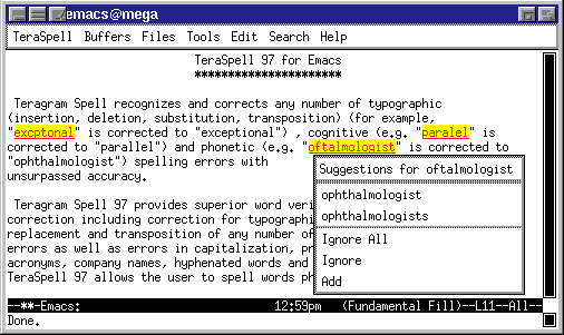 TeraSpell 97 for Emacs is a user-friendly spell checker which incorporates visual highlights for misspelled words and on-the-fly spell checking.
