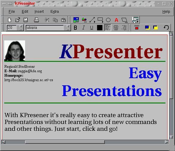 KPresenter is the presentation application of KOffice, which is an integrated office suite KDE. It's the aim of KPresenter to let you create and design attracive pages and screen presentations without a lot of effort - so the easy and attracive GUI is very important for KPresenter. And of course KPresenter has a lot of useful functions which are already implemented, and lots of new functions will get implementied in the future. Another feature of the whole KOffice is that, all applications work and will work together perfectly because of an OLE-like implementation. So you can easily insert and edit a table of KSpread in KPresenter, for example. BUT KPresenter is, like the whole KOffice, currently in development. So there is no publicly released version available yet. But we plan to release the first alpha version soon. If you are interested in a test version (just for playing :-), contact the author. If you want to know what is exactly done and what will be done in KPresenter, take a look at the hompage of KPresenter.