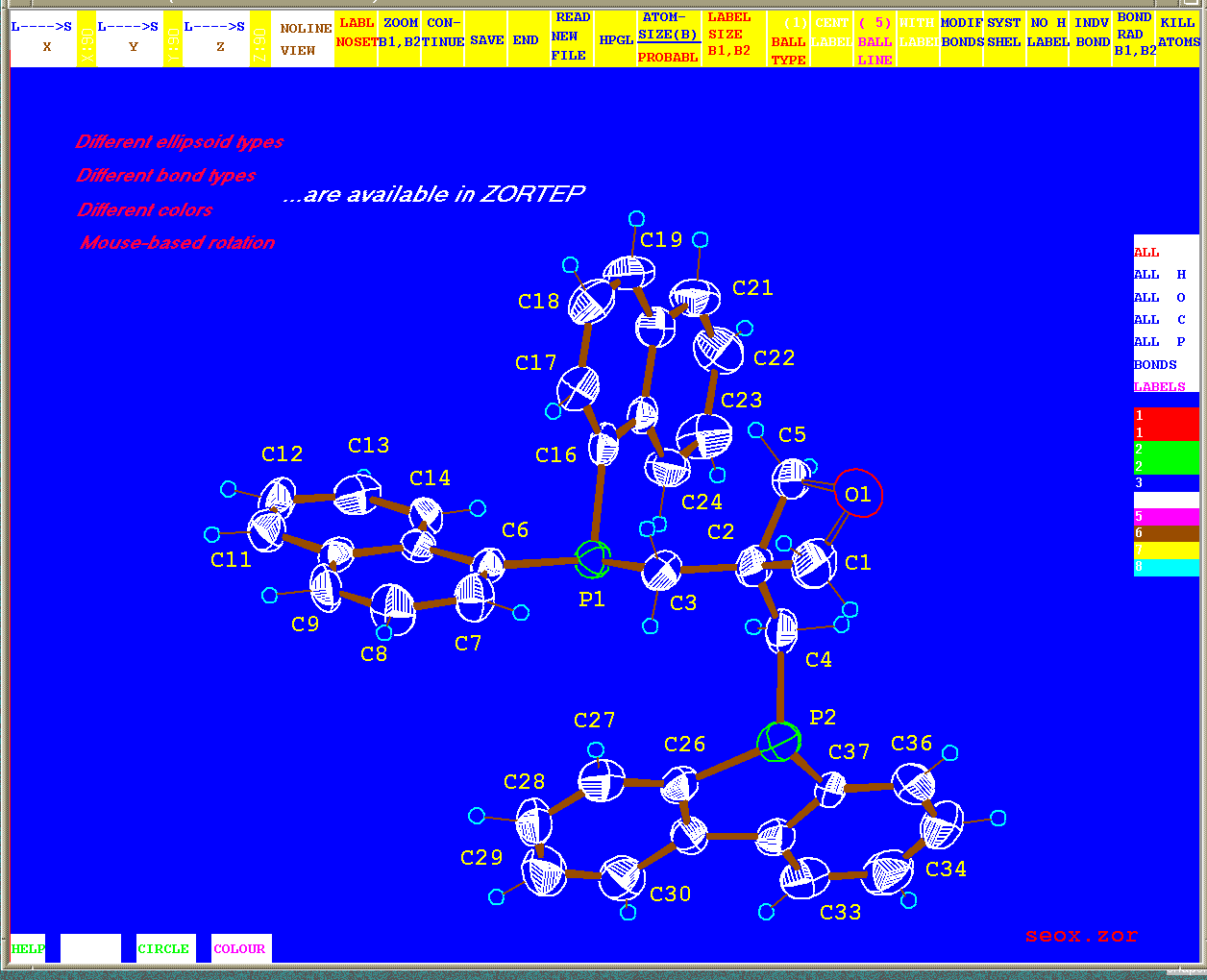 Zortep is the second part of this duo being mouse driven menu based graphical ORTEP program. This allows the 'real-time' graphical rotation and manipulation of structures and/or thermal ellipsoids on the screen. This has been rewritten from old ORTEP source code and has been made user-friendly by the inclusion of a mouse-drivable menu interface. Thus there is no longer any need to know how to input the old style ORTEP cards. ZORTEP can also read SHELX format fractional coordinates and import XPMA files up to 999 atoms. It is possible to get a stereoscopic (read-green) view in both programs on the screen. They can be rotated and translated.
