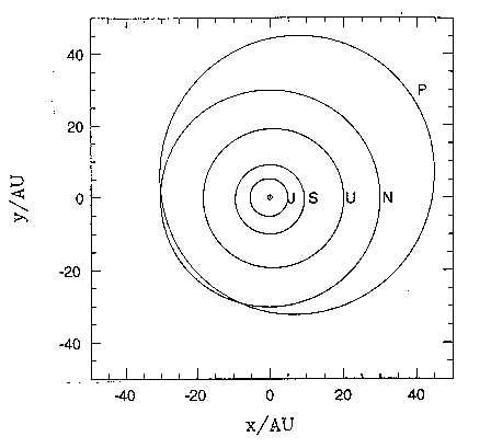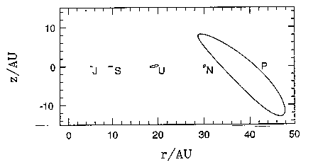 Here we see the z-component of each planet's position plotted against the simultaneous distance from the sun. Most planets only make small excursions in the vertical and radial directions, but Pluto executes a large, tear-shaped figure. This vertical projection shows that Pluto is far from being Neptune-crosser.